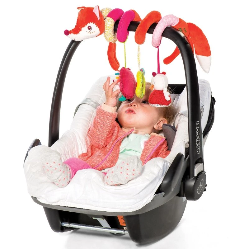 Accrochez Alice la renarde ou vous voulez : la poussette, le cosy, les barreaux d’un lit, le parc, … Bébé pourra s’amuser avec le hochet hérisson, le miroir sous la poule ou la clochette. Les couleurs, les formes, les textures, les bruits, tout est fait pour éveiller les sens de bébé qui prendra beaucoup de plaisir à jouer avec ce jouet d’éveil sous le regard bienveillant d’Alice.