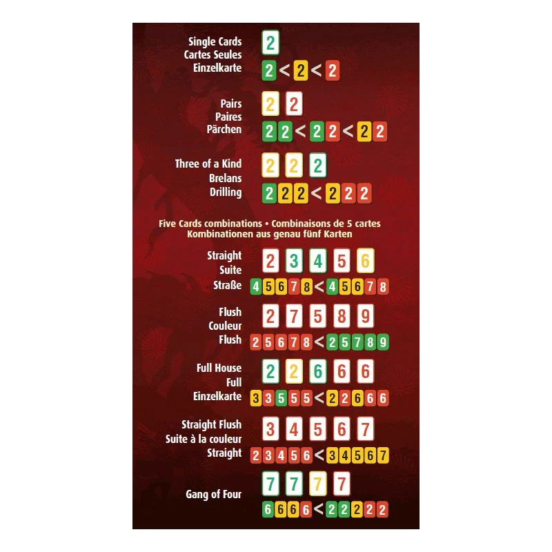 Gang of four est un jeu de cartes basé sur un jeu traditionnel chinois. Le but du jeu est de se débarrasser le premier de ses cartes. Pour se défausser de ses cartes, les joueurs doivent tour à tour créer des combinaisons de cartes (voir description détaillée ci dessous) plus fortes que la précédente.