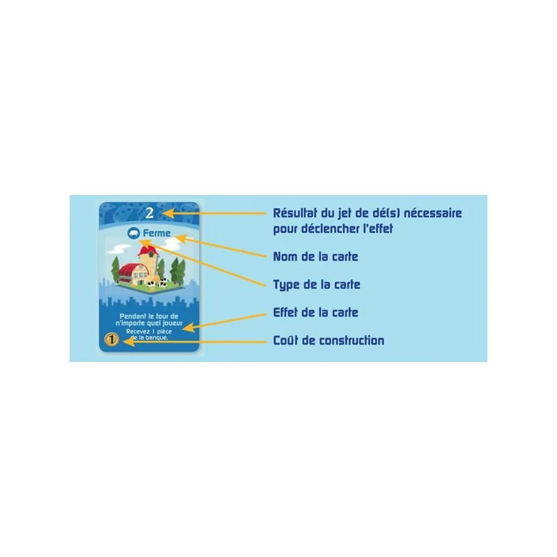Vous allez être à la tête d’une ville et devrez gérer son développement. Vous commencerez avec un champ et une boulangerie et cous tenterez d’acquérir forêt, stade, café, fromagerie, … Chaque bâtiment permettra d’obtenir des revenus de la part de la banque ou des autres joueurs.