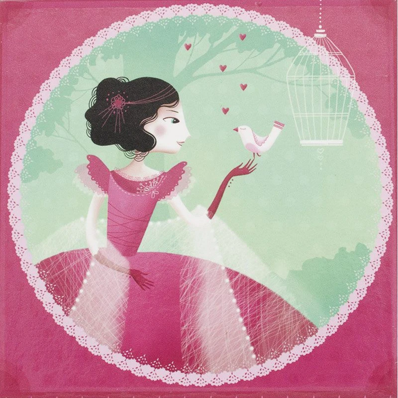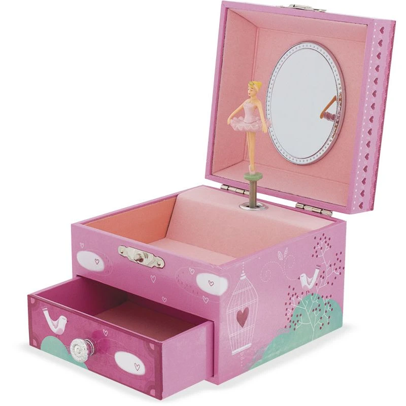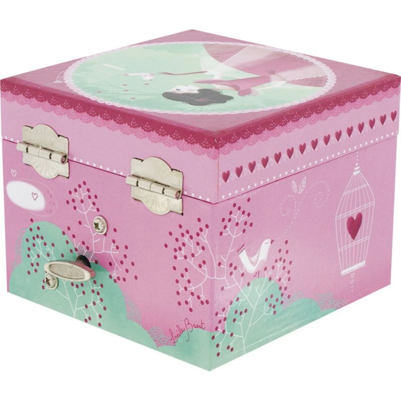Cette petite boîte à bijoux musicale joliment illustrée enchantera votre petite fille en jouant l’air de Cinderella’s dreams of the ball de Prokofiev. Dans les tons vert et rose, la boîte à bijoux cage est illustrée avec une jolie princesse, un oiseau et sa cage. Lors de l’ouverture de la boîte à bijoux, la danseuse dansera au son de la musique. Le mécanisme manuelle (ne nécessitant donc pas de piles) se trouve au dos de la boîte.