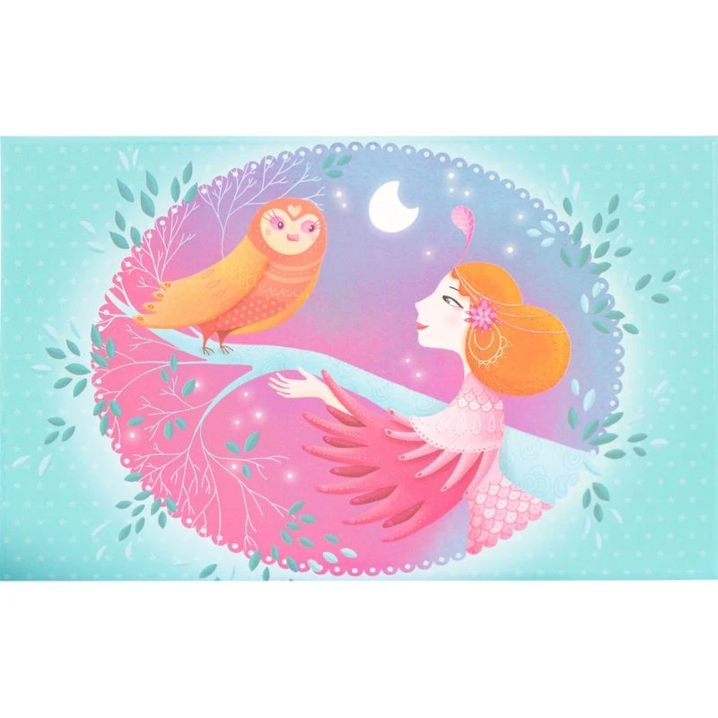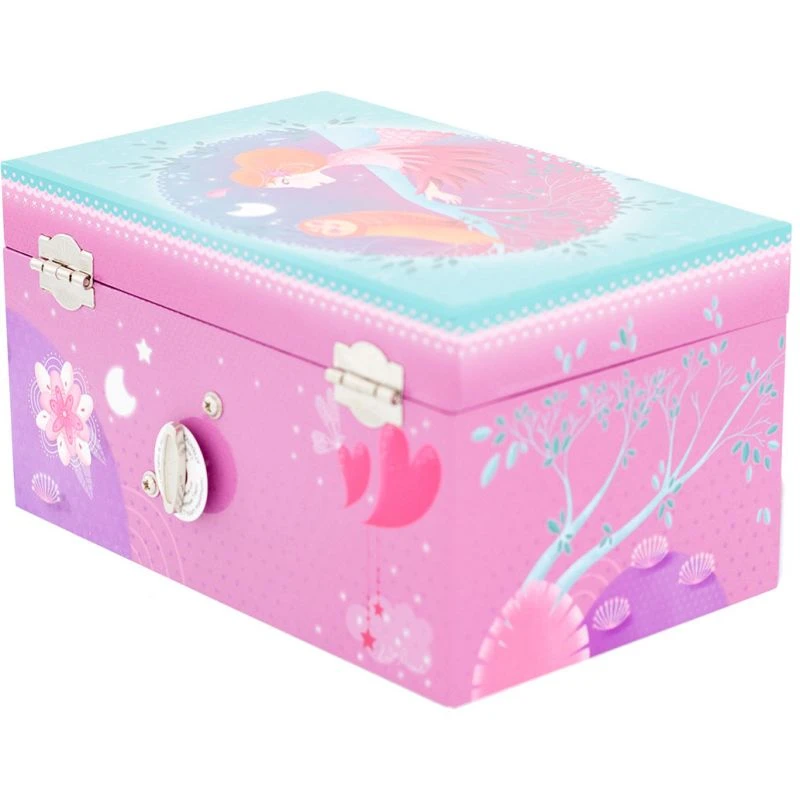 Sur le thème de la forêt au clair de lune, cette jolie boîte à bijoux musicale rose accompagnera votre petite fille sur l’air du clair de lune de Debussy. Lors de l’ouverture de la boîte à bijoux, un petit hibou se mettra à tourner au son de la musique. Le mécanisme manuelle (ne nécessitant donc pas de piles) se trouve au dos de la boîte.