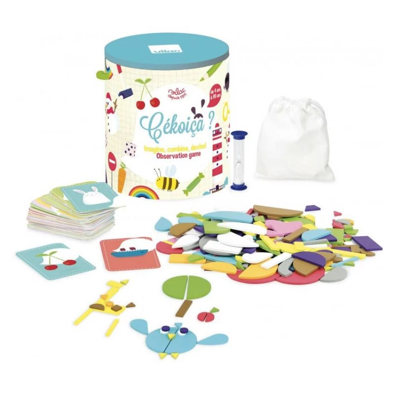 Cékoiça de Vilac est un jeu de rapidité dans lequel il va falloir faire preuve d’imagination pour faire deviner aux autres joueurs ce que représente des images en utilisant les pièces en bois à disposition qui sont de formes, de tailles et de couleurs différentes.