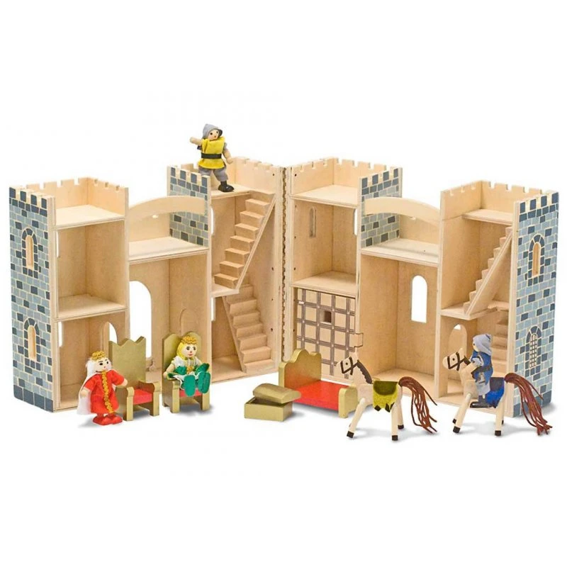 Les petits garçons adoreront jouer avec ce joli château fort médiéval en bois. Ce château en bois comporte deux tours et un pont levis. Ouvrez le et découvrez l’intérieur du château avec ses 2 étages, ses escaliers permettant de monter en haut des tours et sa prison.