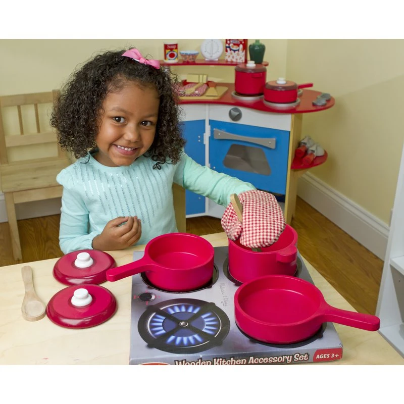 Superbe dinette en bois de 8 pièces composée d’une poêle, d’un faitout, d’une casserole, de 2 couvercles adaptés, d’une manique et de 2 cuillères en bois. De quoi préparer de délicieux repas! Complément indispensable aux cuisines en bois pour enfant cet ensemble permettra à votre enfant d’imiter papa ou maman lors de la préparation des repas.