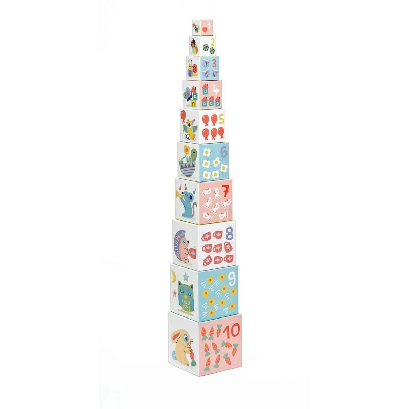 BabyBloki est un jeu de cubes à empiler de la collection Baby blanc de Djeco. Cette collection est caractérisée par des couleurs pastel très douces et des illustrations adaptées aux jeunes enfants dès 12 mois. Cet ensemble de 10 cubes à emboîter ou superposer permettra à bébé d’exercer sa dextérité et sa logique. Les cubes présentent sur 4 de leurs faces des illustrations que l’enfant pourra coordonner. Sur une face, les cubes sont numérotés de 1 à 10 du plus petit au plus grand avec des petits dessins répétés autant de fois que le chiffre indiqué et qui permettront aux enfants une première approche des chiffres.