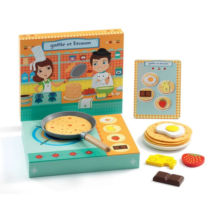 Gaëlle et Titouan est une dînette Djeco qui propose de jouer à la crêperie bretonne en confectionnant des crêpes et des galettes. Comme dans toutes les dînettes Djeco de cette gamme, le coffret en bois sert de support et de décor pour le jeu.