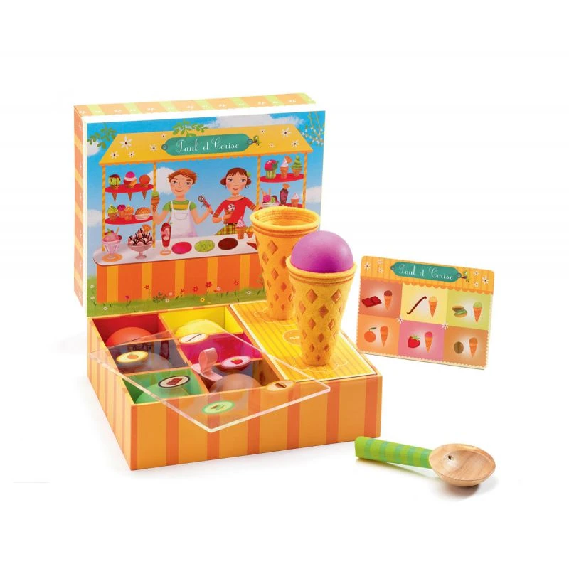 Les enfants aiment les glaces et ils seront enchantés de pouvoir jouer au glacier et vendre des glaces en proposant les différents parfums à leurs invités. Ce joli petit coffret en bois et feutrine de vendeur de glace leur demandera de la dextérité et de la concentration pour servir de beaux cornets sans renverser les boules. La boîte illustrée servira de décor au jeu.
