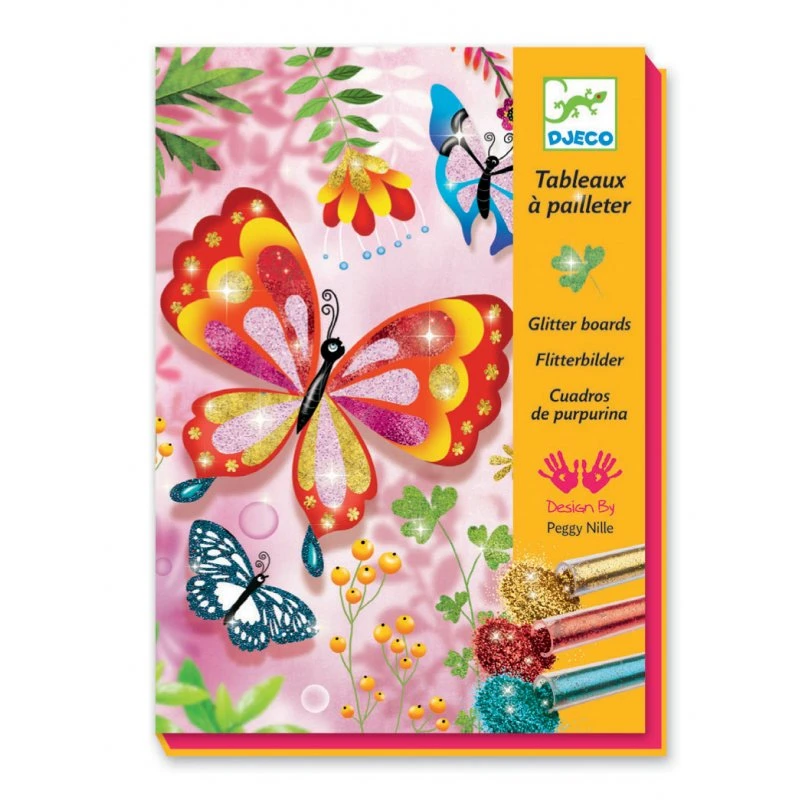 Avec le coffret de loisir créatif papillons Djeco, votre enfant pourra réaliser 4 splendides tableaux poétiques sur le thème des papillons. Ce coffret contient tout le nécessaire pour la réalisation : les 6 tubes de paillettes, les 4 tableaux à pailleter, un outil pour enlever les parties encollées, un pinceau pour retirer le surplus et le livret explicatif pas à pas.