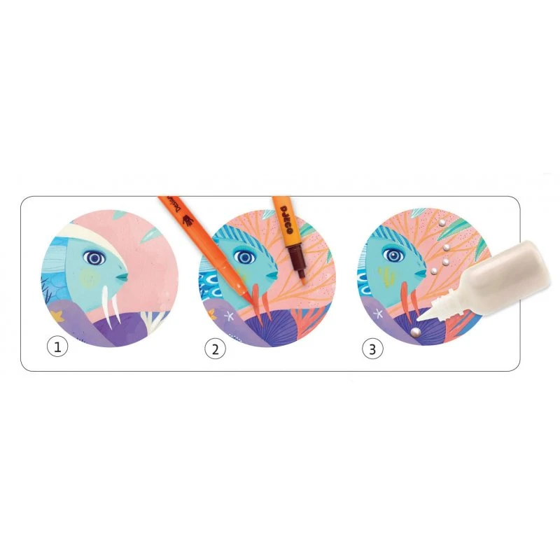 Djeco vous fait découvrir le monde sous marin avec ce coffret de feutres pinceaux « Sous la mer ». Ce coffret contient 4 planches illustrées à colorier avec les feutres et à décorer avec la peinture nacrée.