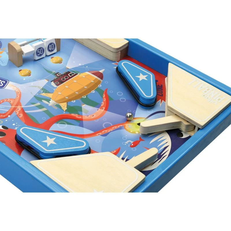Comme sur les vrais flippers, les enfants à partir de 5 ans pourront s’exercer à faire des amortis et bloquer la bille avec les batteurs et s’amuseront dans ce joli décor marin. Un jeu d’adresse original qui fera une belle idée de cadeau.