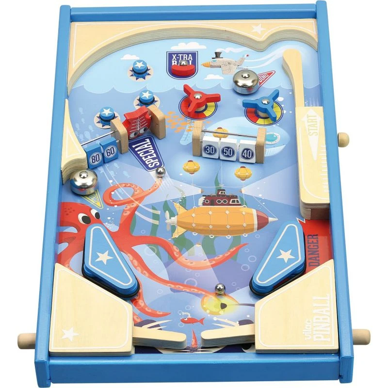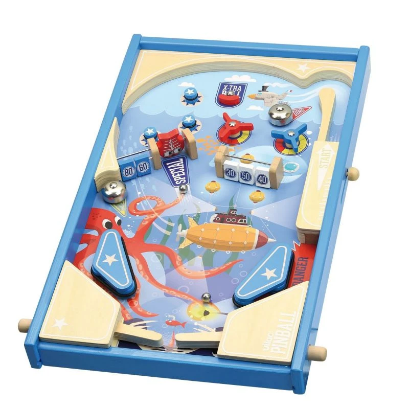 Vilac vous présente son grand flipper en bois Sous la mer. Les enfants découvriront avec joie les bumpers et kickers sur lesquels les billes vont rebondir, les tourniquets avec leur lot de points, les clochettes et même le bonus extra ball.