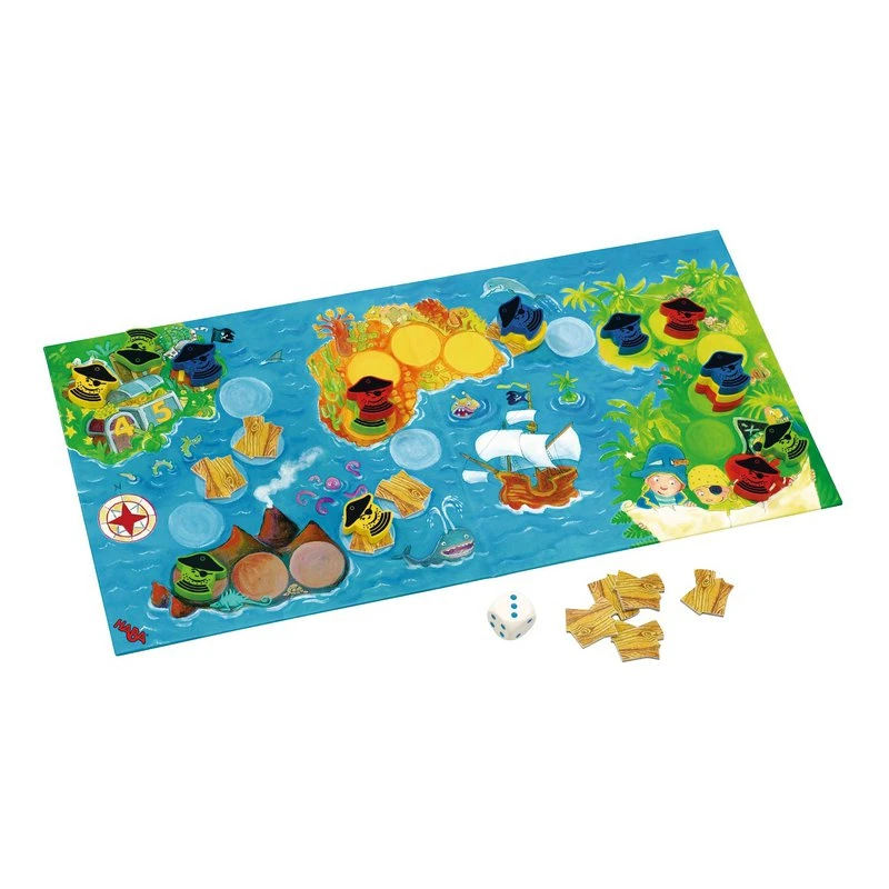 Pour les petits pirates, ce jeu d’apparence simple vous révélera des trésors de stratégie. Le but du jeu est d’atteindre l’île aux trésors et de récupérer les trésors qui s’y trouvent. Mais pour cela il faudra traverser les mers et la course sera très tactique car vous pourrez à l’aide de planches vous faciliter le passage entre les îles ou encore bloquer les autres pirates…