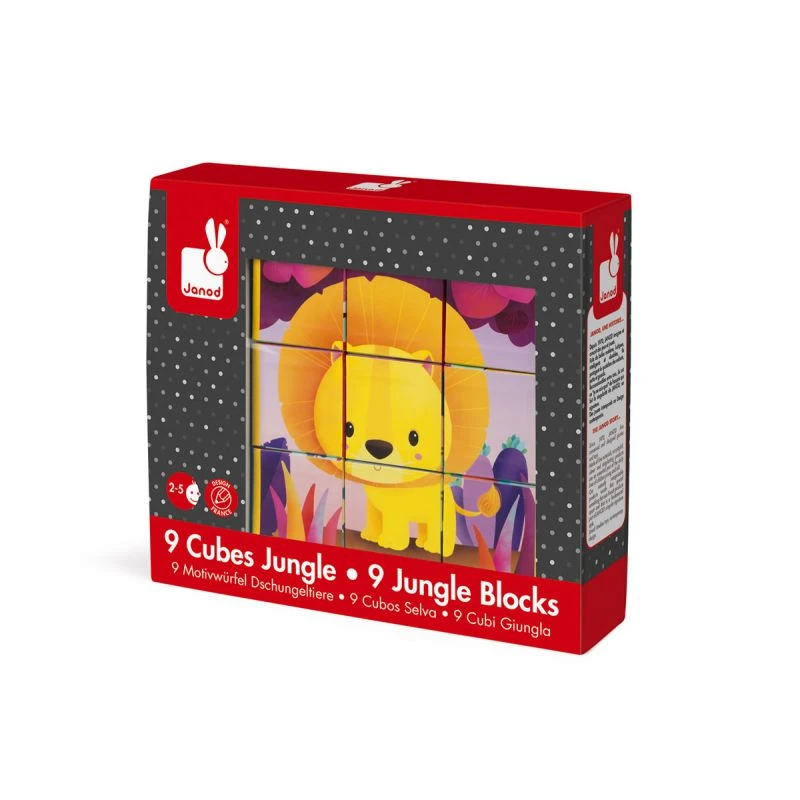 Ces 9 jolis cubes aux couleurs vivantes représentent des animaux de la jungle dans leur environnement très coloré. Ils vont encourager votre enfant à développer son sens de l’observation.