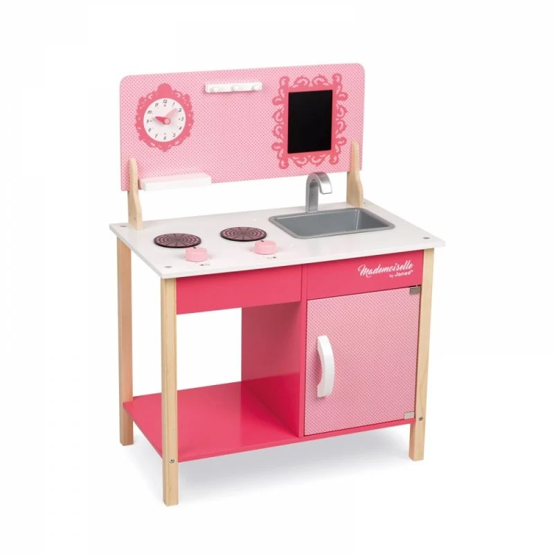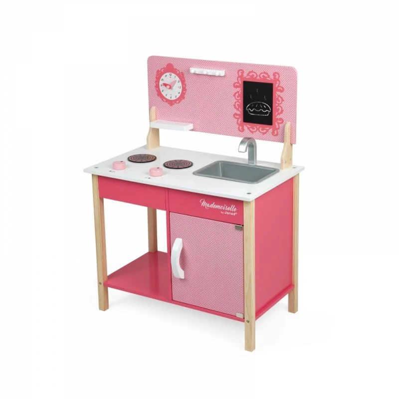 La cuisine « Ma première cuisine Mademoiselle » est une cuisine en bois pour enfant robuste et moderne. Elle dispose d’un grand évier et d’un grand placard équipé de charnières métalliques. Les deux plaques vitrocéramiques sont commandées par les deux boutons rotatifs. Une horloge permettra de garder un oeil sur les temps de cuisson et la patère permettra d’accrocher les ustensiles.