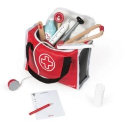 Cette mallette de docteur est non seulement complète mais Ă©galement très rĂ©aliste. Les instruments en bois massif sont très bien pensĂ©s comme la seringue Ă©quipĂ©e d’un ressort intĂ©rieur ou l’otoscope (pour inspecter le conduit auditif) qui est Ă©quipĂ© d’une loupe. A l’aide des 10 accessoires fournis, votre enfant pourra soigner tous les bobos de ses doudous et mĂŞme la famille entière !