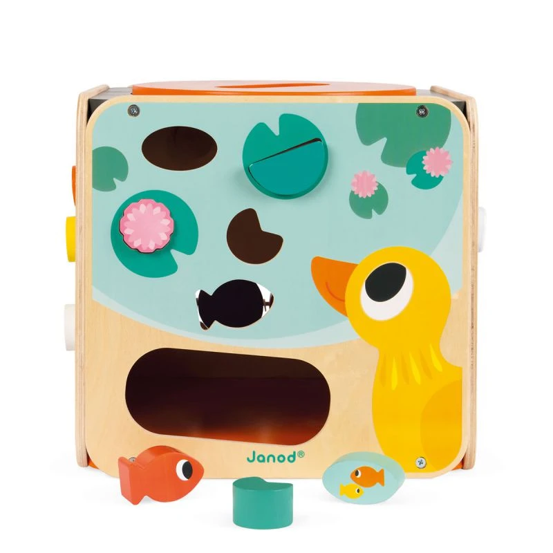 Maxi looping est un cube d’activités en bois avec 8 activités. Bébé découvrira