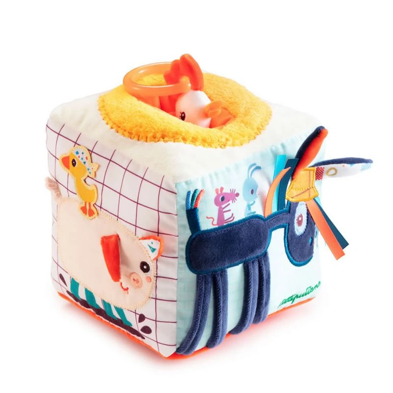Un très joli cube stimulant aux nombreuses textures et couleurs facile à prendre en main pour les bébés à partir de 9 mois