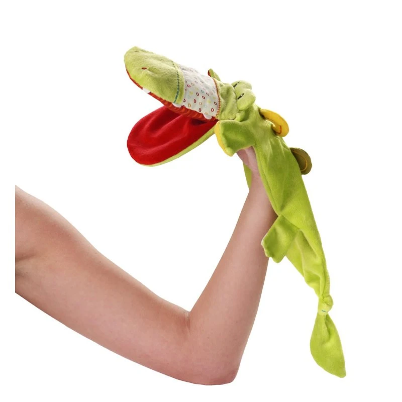 Théophile le gentil crocodile est un doudou très doux et très joueur avec ses écailles colorées, sa grande bouche rouge et ses petites dents blanches.
