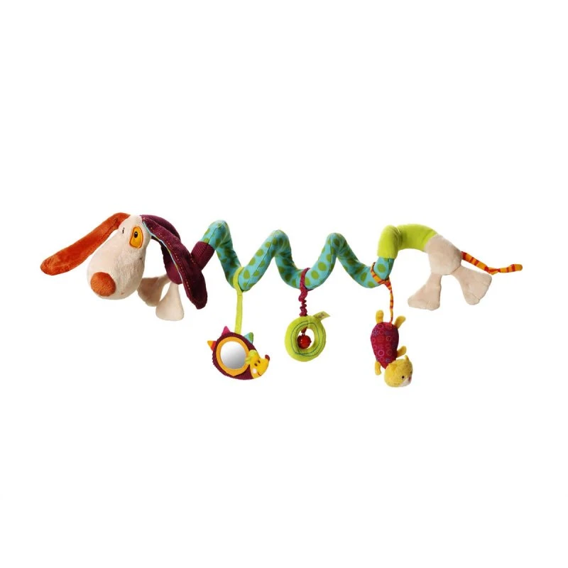 Accrochez la spirale d’acitivités Jef le chien ou vous voulez : la poussette, le cosy, les barreaux d’un lit, le parc, … Bébé pourra s’amuser avec le miroir hérisson, le hochet ou la clochette. Les couleurs, les formes, les textures, les bruits, tout est fait pour éveiller les sens de bébé qui prendra beaucoup de plaisir à jouer sous le regard coquin de Jef.