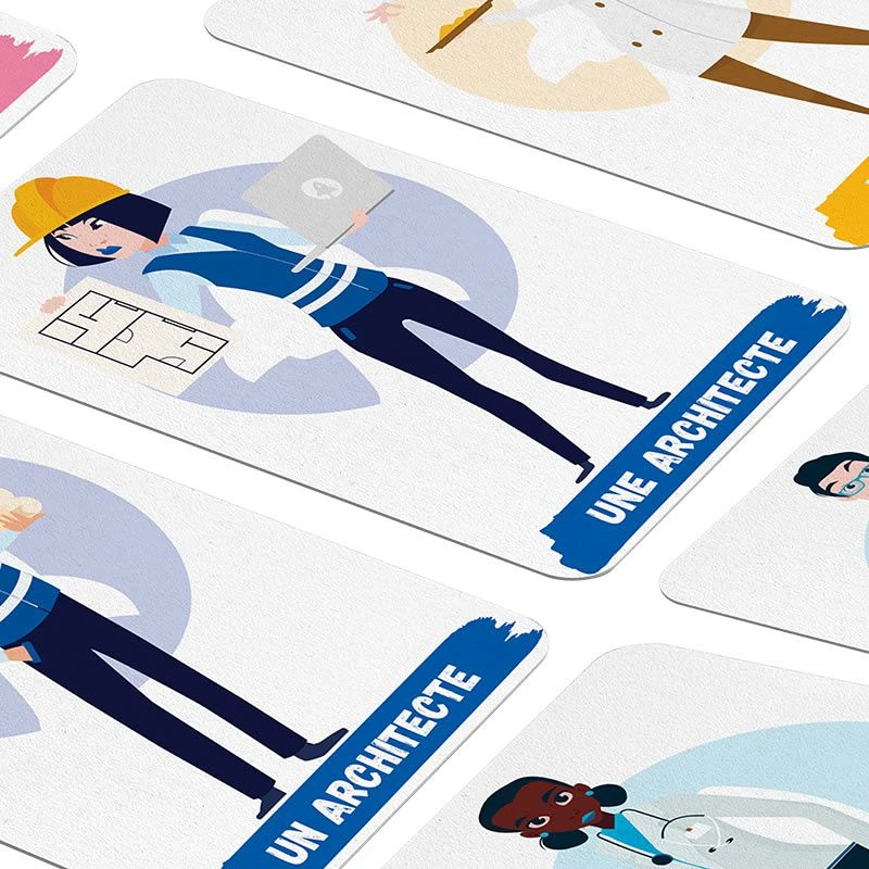Ce jeu permet de sensibiliser les jeunes enfants à l’égalité dans le monde professionnel. Il va même au delà de l’égalité homme / femme en mettant en avant des personnes de couleurs ou de morphologies différentes ou encore présentant un handicap pour en faire un jeu reflétant réellement notre société.