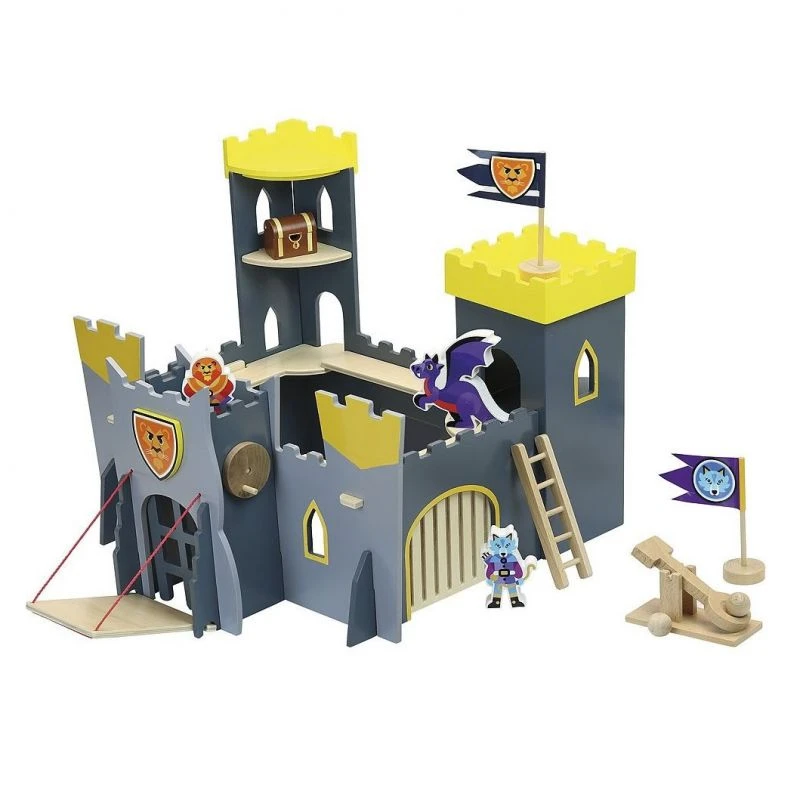 A la fois classique et original ce château trop fort de Vilac vous propose un château fort en bois avec ses créneaux, ses tours, son chemin de ronde, ses portes à herse, son pont levis … et des figurines représentants des animaux imaginaires qui pourront tour à tour jouer le rôle de défenseurs du château ou assaillants.