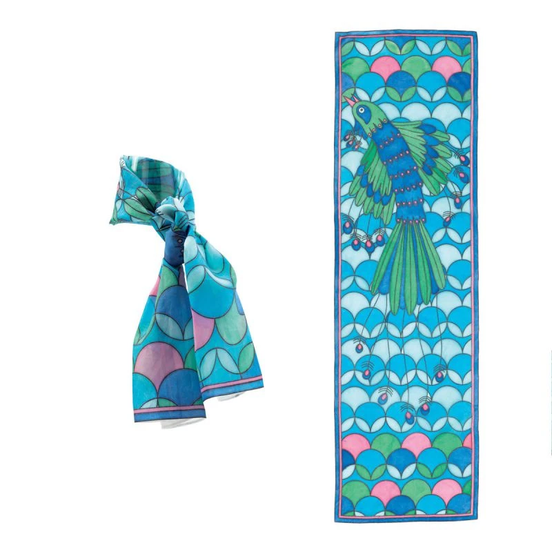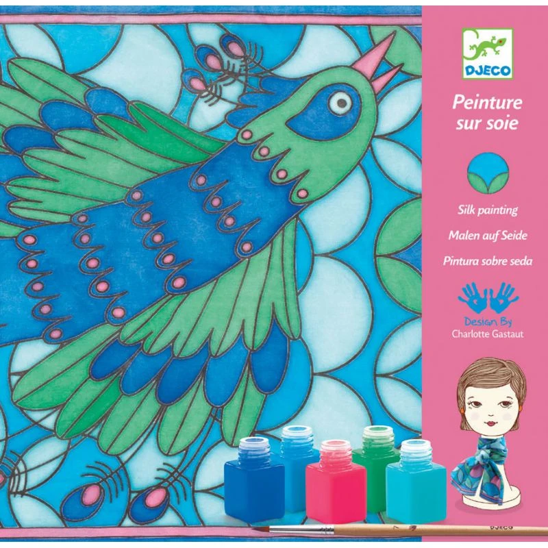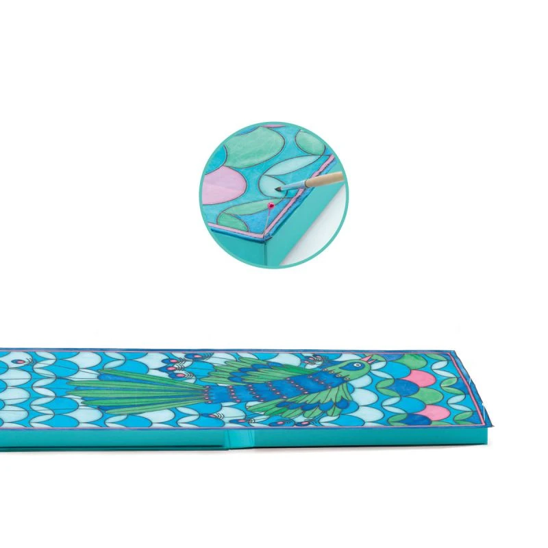 Le paon est un coffret de loisirs créatifs permettant de réaliser un joli foulard en soie dans les tons bleus et verts avec quelques pointes de rose.. L’enfant devra peindre le foulard en le fixant à l’aide des épingles sur le coffret qui déplié set de cadre. Un sèche cheveux sera nécessaire pour fixer les couleurs.