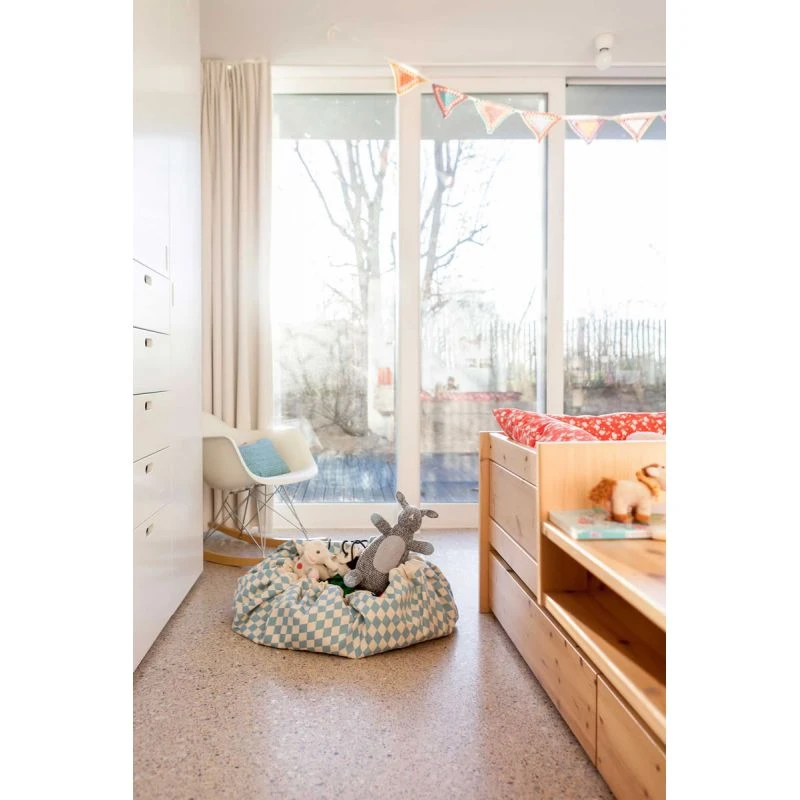 Dans ce coloris diamant bleu ce sac à jouets conviendra aussi bien à une chambre de garçon qu’à une chambre de fille.