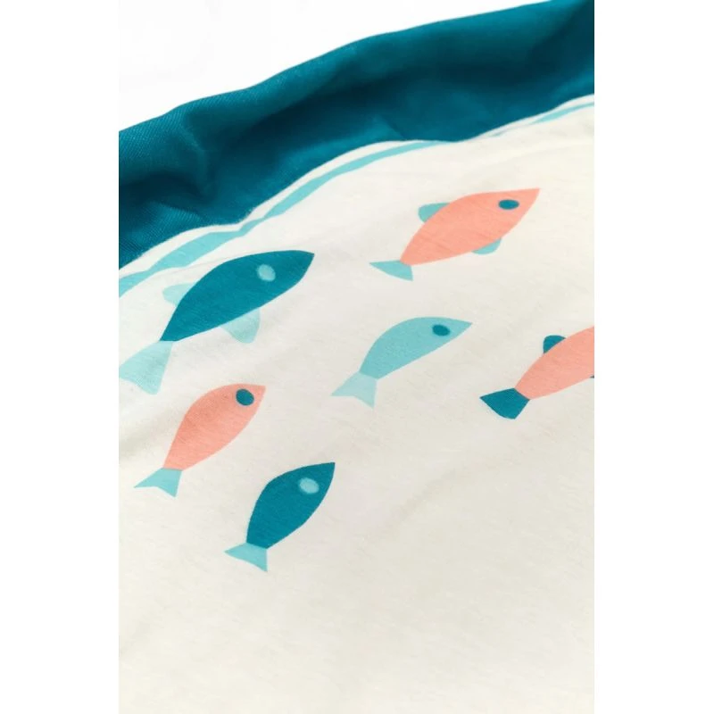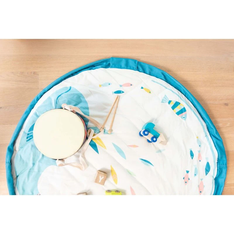 Créé en collaboration avec la célèbre marque française Moulin Roty ce joli tapis d’éveil présente côté face la baleine Olga et une myriade de petits poissons colorés aux jolis motifs. Les couleurs sont douces et l’ensemble très harmonieux. Côté pile le sac est orné de plumes délicatement colorées.