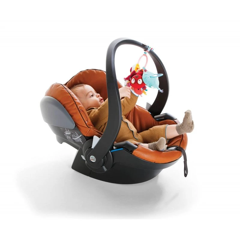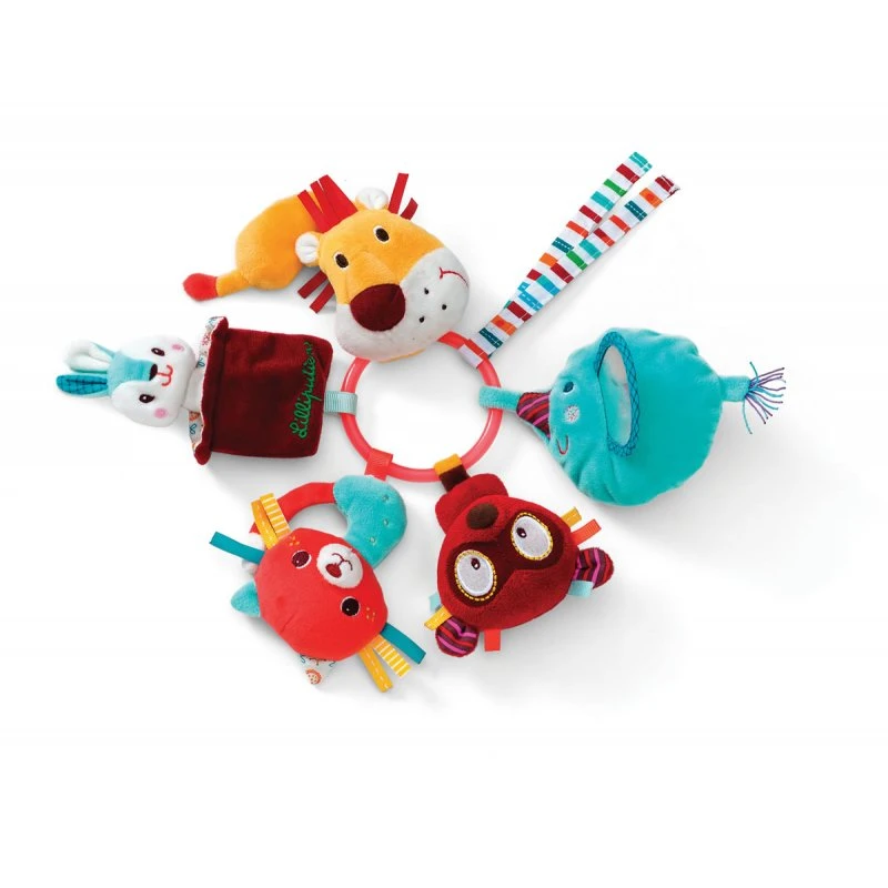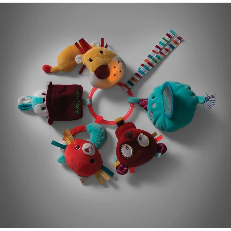 Un trousseau de clefs plein de surprises. Bébé pourra s’amuser avec Albert l’éléphant et son miroir, Georges le lémurien qui fait un son de poussin, Colette le chat qui fait office de hochet, le lapin caché dans le chapeau de magicien ou en core le lion dont les babines clignotent lorsqu’on lui appuie sur le nez. Un vrai spectacle a emmener partout grâce à son attache.